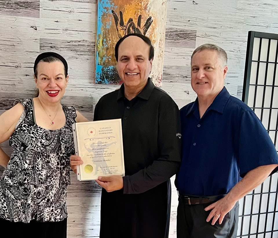 I have been taking Argentine Tango group and private lessons from Sudhir Gandhi for two years. Sudhir’s strong knowledge of the syllabus for Tango, Vals, and Milonga has been demonstrated through his teaching of the technical aspects of terminology, footwork, musicality, and correct embrace. These teachings have resulted in such greatly improved proficiency in the Vals and in my self confidence on the dance floor that I placed first at the Royal Ontario Ball Canadian Open Dancesport Championships held on May 10, 2025. Sudhir is a knowledgeable, passionate dance instructor who I would highly recommend for Argentine Tango dancers